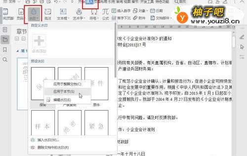 5点击菜单栏的【插入】—【水印】,【鼠标右键】单击选择设置好的【水印文本】,点击选择【应用到本节】;