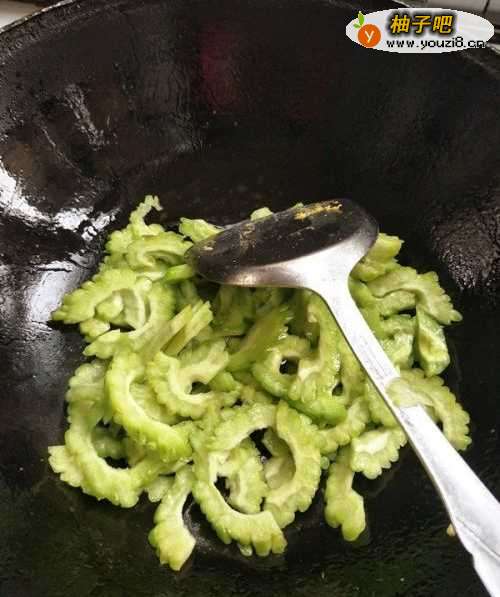 4锅中再次加入少量花生油,烧热后放入苦瓜,不断翻炒。