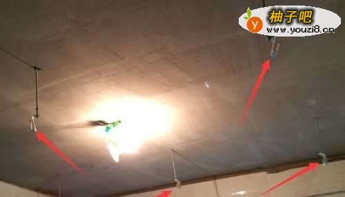 2将吊顶专用的吊杆按垂下的长度截断,把专用的吊件用螺丝给固定好,如图所示。然后用冲击钻在顶棚上钻眼,要按照挂龙骨的位置钻,每一排钻两个就行。
