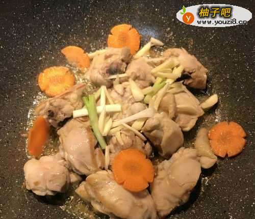 3鸡肉上色后,放入蒜片、葱白与红萝卜片炒出香味