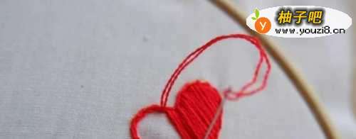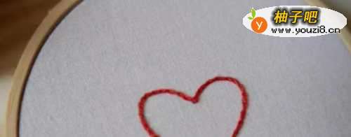 4然后再沿着爱心的轮廓,一点一点向两边开始绣,沿着统一的方向并排刺绣,一定要仔细。
