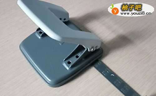 10也可以利用打孔机的底部塑料标尺打孔,比如A4纸,则将标尺调至A4标尺处,然后张纸一边对着黑边条,按下即可。