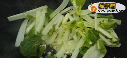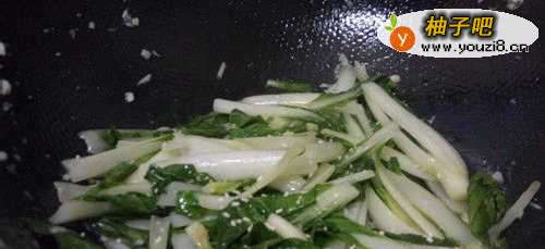 3热锅,下油,高温爆香蒜末,先放青菜梗