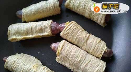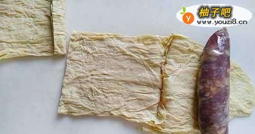 将豆皮摊开后切半,半片豆皮裹1条香肠。