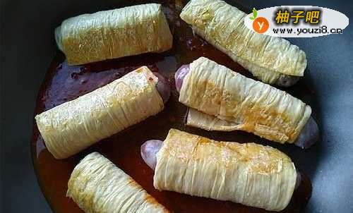 4掀盖后再转动香肠豆皮卷,让表面裹层辣酱即可。