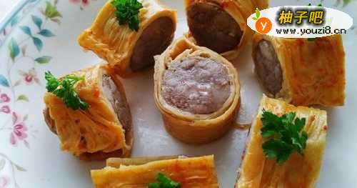 1.将豆皮摊开后切半,半片豆皮裹1条香肠。2.不沾平底锅倒入少许油热锅,放入香肠豆皮卷,盖上锅盖小火闷煎约3~5分钟。3.将香肠豆皮卷翻面,辣炒酱与水拌匀后倒入锅中,续闷煎约5分钟。4.掀盖后再转动香肠豆皮卷,让表面裹层辣酱即可。5.切片后看起来比较可爱,加点小巴西里叶装饰一下。