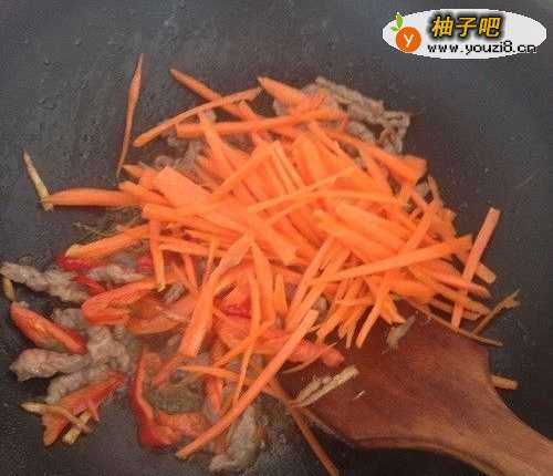 5热锅倒油,油热后,放入姜丝爆香,然后加入牛肉丝翻炒,等肉丝翻炒变色后,倒入红甜椒一起翻炒。