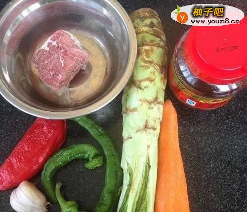 准备所需食材:牛肉、青笋、红甜椒、青辣椒、蒜、姜、胡萝卜、豆瓣酱等。