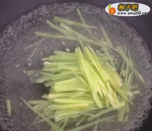 3在锅里烧开水,将青笋放进开水中焯熟;牛肉也切成肉丝,并加入少许淀粉、胡椒粉、生抽用手抓匀腌渍10分钟。