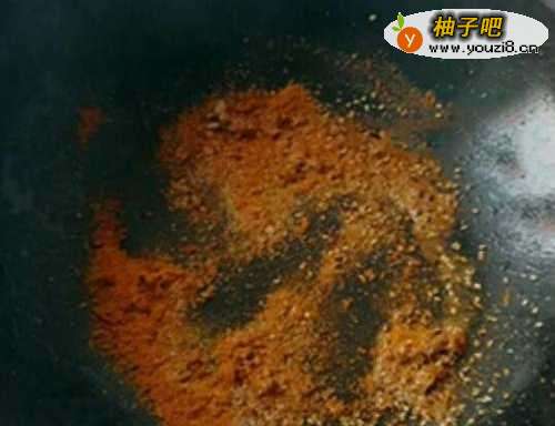 5将锅中的油倒出,放入适量盐、花椒粉、孜然粉和辣椒粉