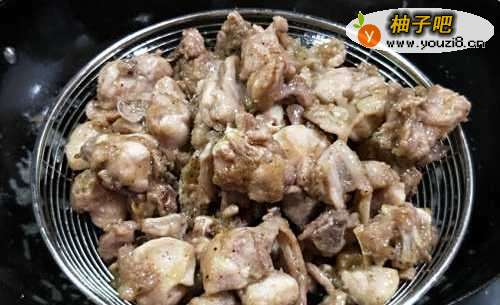 2起油锅,倒入宽油,油烧热放几粒姜,立马上浮就可以将腌好的兔肉下锅滑炒