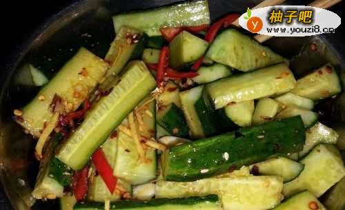 4把切好的黄瓜,葱,辣椒放入盆里,依次再放入已泡好的生姜和蒜汁,盐,味精,豆油,搅拌均匀,滴上花椒油即可装盘完成