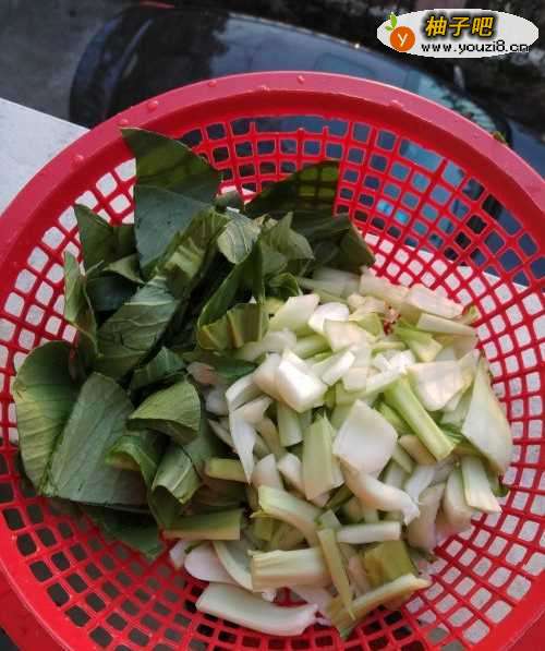 2将切好的杆子和叶子分开,因为杆子不容易熟,所以要先下锅炒