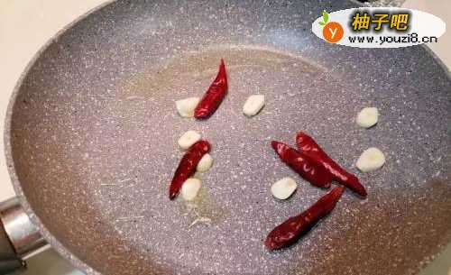3热锅加1匙油,把蒜片及干辣椒下锅爆香