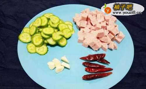 小黄瓜切薄片,午餐肉切成丁状,蒜头切片彩联备用