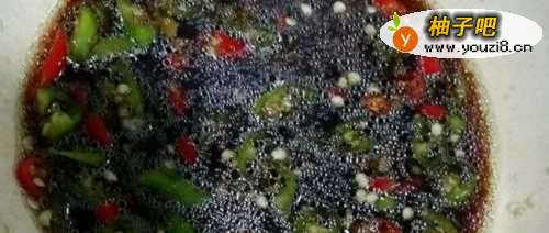 4接下来,准备好调味的料:在碗中倒上适量的醋,加上一勺香油,搅拌均匀,然后,把葱,蒜以及小米椒都切碎,加入醋中,如下图。