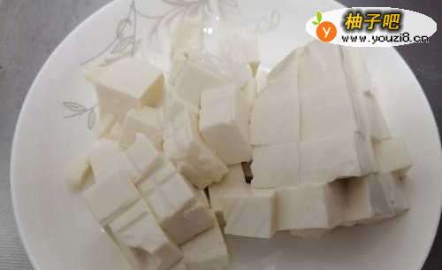 3等豆腐炖煮入味后,倒入玉米淀粉加水的勾芡汁。