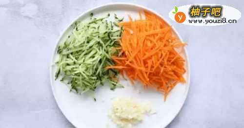 1、把胡萝卜去皮切成丝,黄瓜也切成丝,大蒜剁成蒜蓉。如果刀功不行,还是用刨丝器来刨吧!不瞒大家,我就是刀工不好,用刨丝器又快又方便。