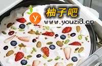 6将所有水果、坚果、果干等放在酸奶表面。