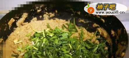6大概翻炒十分钟后,倒入切好的韭菜。把韭菜翻炒均匀