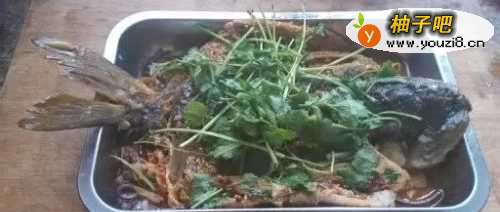 5然后将香菜蒜泥,孜然粉,葱花洒在鱼身,待汤汁收到鱼底部即可出锅上盘(铁盘哦)