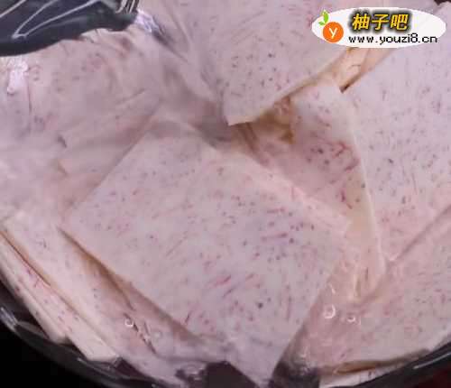 2然后把切好的香芋片,清水浸泡2次,沥干水分。
