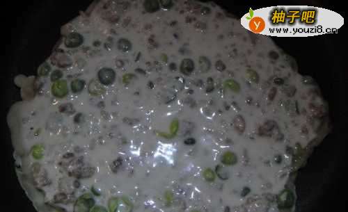 9把拌匀的豌豆肉糊倒入锅内