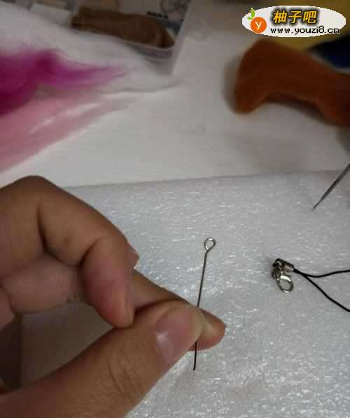 3鼻子和头部分界线制作:取一缕红色羊毛,用手捻一下