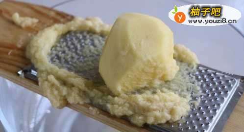2土豆用研磨器研磨成土豆泥;小心别把手弄伤了