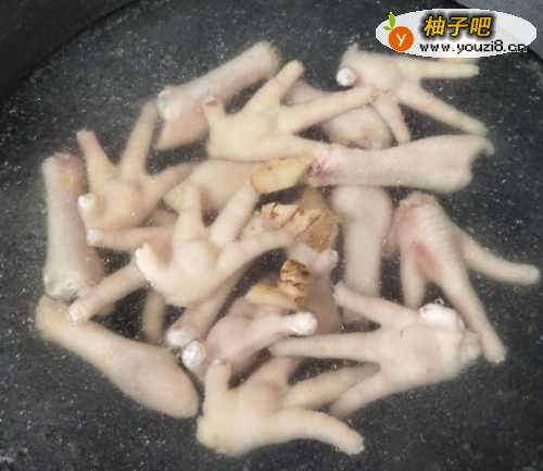 6锅烧开水,水中加入适量料酒和生姜,放入鸡爪煮至水再次沸腾。即捞出用清水清洗,去味。沥干水份备用。