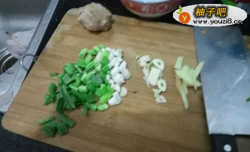 3生姜洗干净切片,蒜头洗干净切小片,蒜叶洗干净切小段。