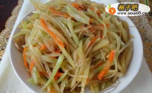 7土豆断生后加入笋丝和胡萝卜丝,继续翻炒