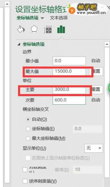 6在【设置坐标轴格式】对话框下,在坐标轴选项中的边界下最小值为0,保持不变,最大值改为15000,单位下面的主要为3000。右边的坐标轴也用同样的方法设置即可。