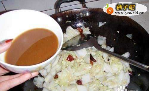 8放姜、蒜、辣椒后放入白菜翻炒