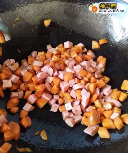 4将切好的火腿肠丁倒入锅中与胡萝卜丁混炒,炒至九成熟