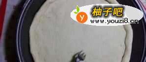 10将其中一份擀成9寸的披萨盘大小,饼底用叉子扎些小眼(不扎也行。)并做出边子。按同样的方法做另十一寸烤盘饼底。