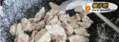 2找个小盘装生粉,并将芋头块一个个裹上生粉。