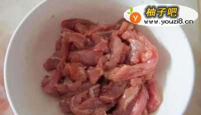 2第二步是食材的加工。这里主要需要处理的是瘦肉,瘦肉如果不加处理直接与青椒搭配去炒的话,瘦肉会很没有韧性,因此需要取一个大一点的碗,往里头敲一个鸡蛋,加入淀粉适量、盐巴、味精、酱油各少许,再与瘦肉混合搅拌均匀,静置3分钟。