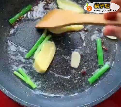 3起锅烧油,姜、葱、蒜、花椒爆香。