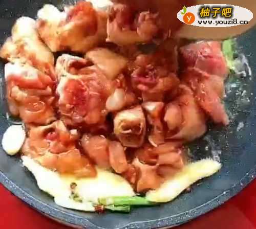 4把腌制好的鸡肉倒入锅中,煸炒至金黄。