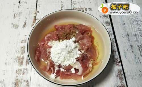 3切好的肉片中加盐、料酒、胡椒粉、淀粉和蛋清抓匀腌制一会