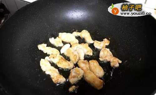 6放入鸡柳,加一点辣酱、盐调味,略为翻炒