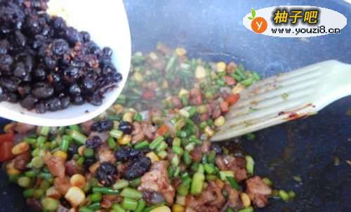 7接着加入适量豆豉,少许盐,炒匀之后,加少许开水,焖一二分钟就OK了。