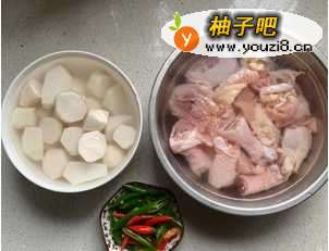 鸡腿切块,清水浸洗去除血水,捞出沥干。芋头去皮后切块,水中泡着备用。