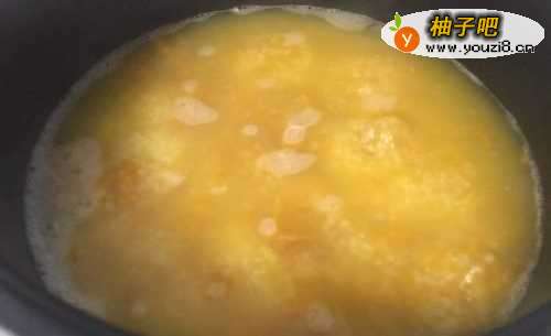 6待粥煮好后,用勺子将南瓜块压碎,让南瓜与粥融为一体。加少许盐、油,拌匀后食用。