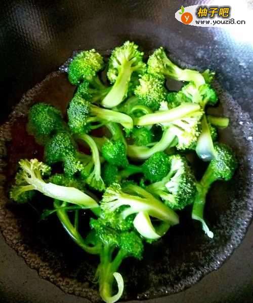 6加入西兰花和西兰花翻炒,依次加入盐,蒸鱼豉油(大概3小匙),少量水,最后些许味精。