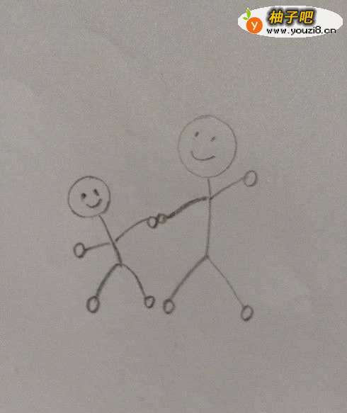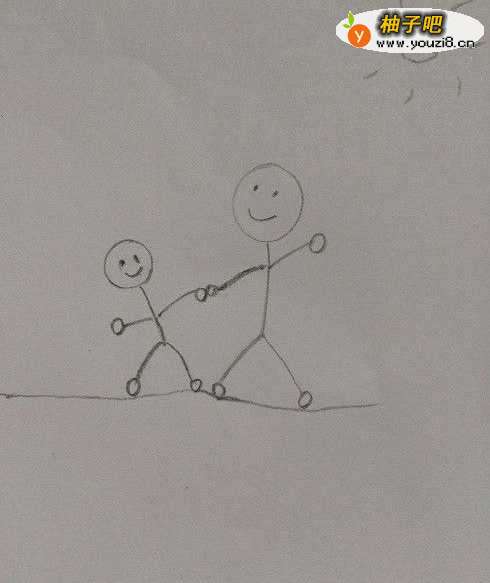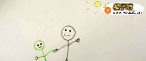 4画出宝宝的身体、手臂和腿脚。注意要使爸爸的手牵着宝宝的手。