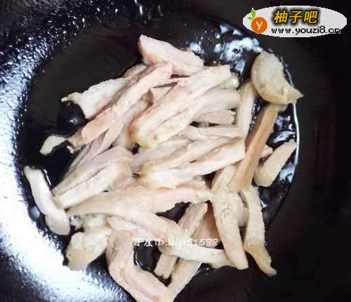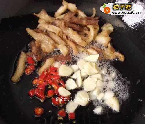 6现在已经把肥的肉炸出好多油来了,放入大蒜和红辣椒炒香。