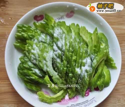 准备1条苦瓜洗干净,切成两半去籽之后,切成斜片,装在盘子里加入两大勺盐腌制5分钟左右备用。现在看到苦瓜上面的盐多一点,不会咸的,因为待会还要焯水的。