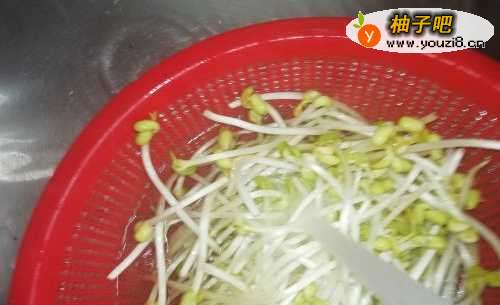 5将200克豆芽摘洗干净、找一个大盘,将豆芽垫在下面备用。